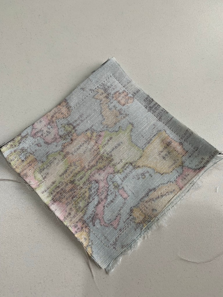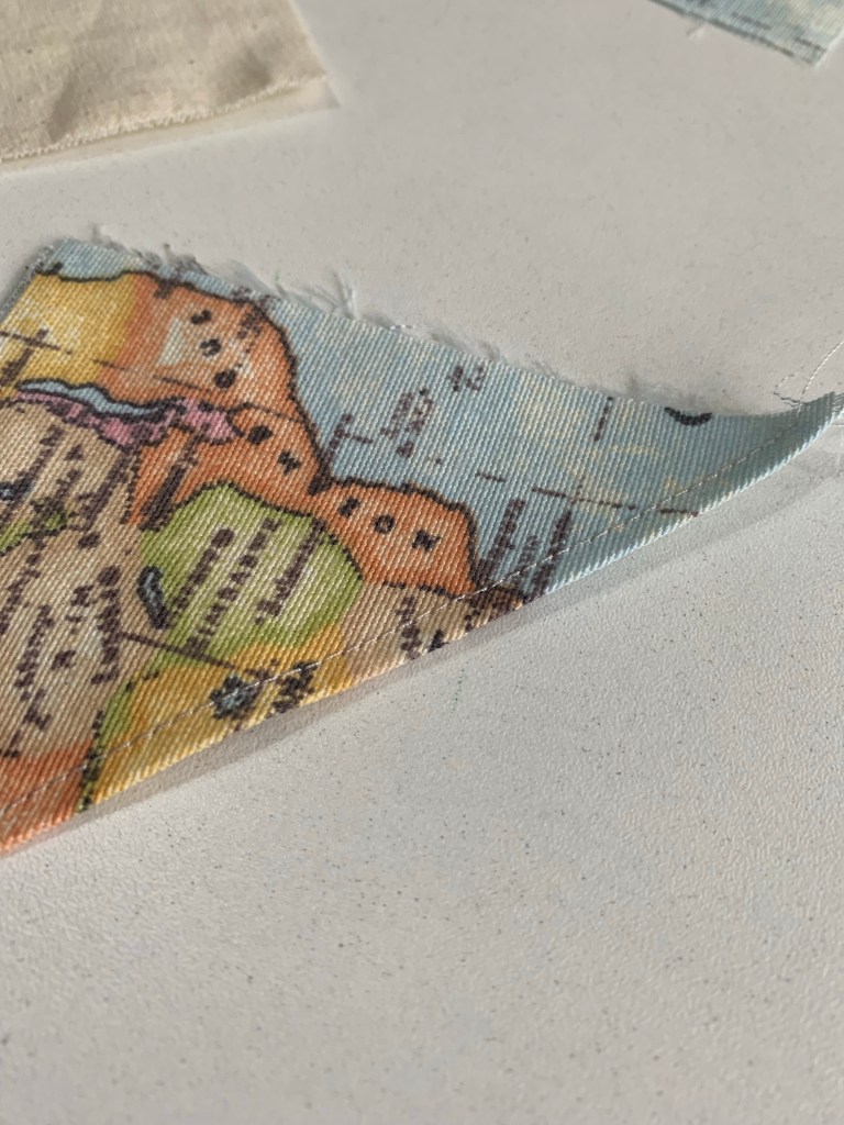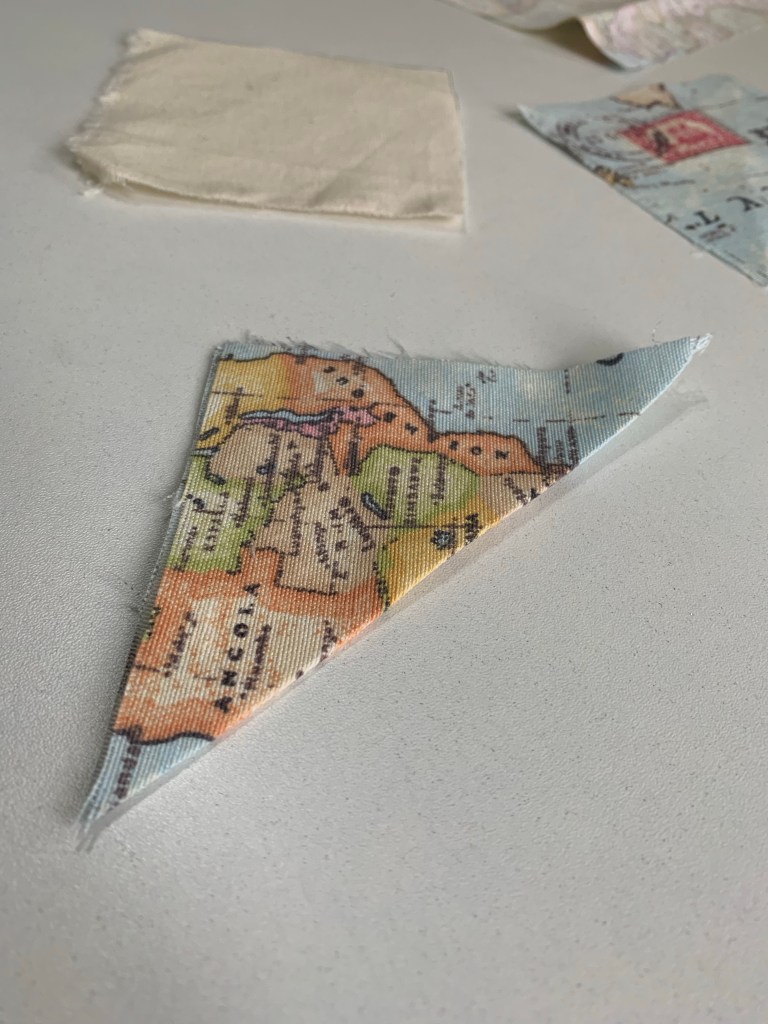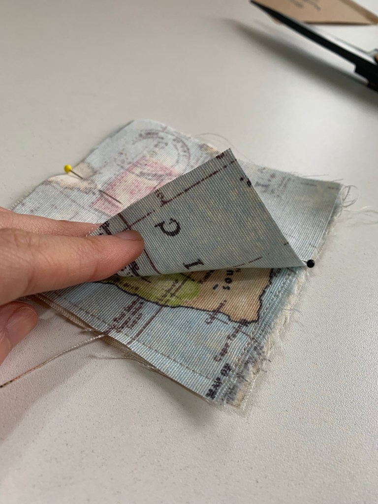 Com o molde pronto, corte 3 x no tecido da sua escolha.Um dos quadrados dobre na diagonal, conforme a imagem.Faça um pesponto nele (o pesponto é a costura que aparece).Agora costure esta metade em um dos outros quadradinhos cortados.Depois, é só colocar o último quadradinho restante por cima, direito sobre direito do tecido, e costurar com 1cm de margem, deixando uma abertura para desvirar.Assim que fica, com uma pequena abertura para desvirar tudo depois.Corte os quatro cantinhos do quadrado conforme a imagem (o famoso truque de costureira para as pontas ficaram perfeitas).Depois de desvirar, ajeite os cantos e passe à ferro, pespontando todos os lados, dando arremate ao final.E está pronto o teu marcador de página!